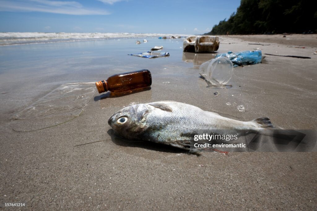Dead fish on a tropical beach surrounded by washed up garbage including bottles and plastic bags.
